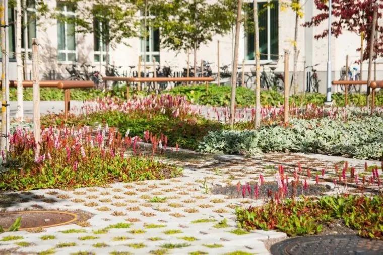 位于主入口處的植物園廣場種植了多種樹木,連同種植的鋪路路縫、戲謔的樹木和水等元素,共同構成了