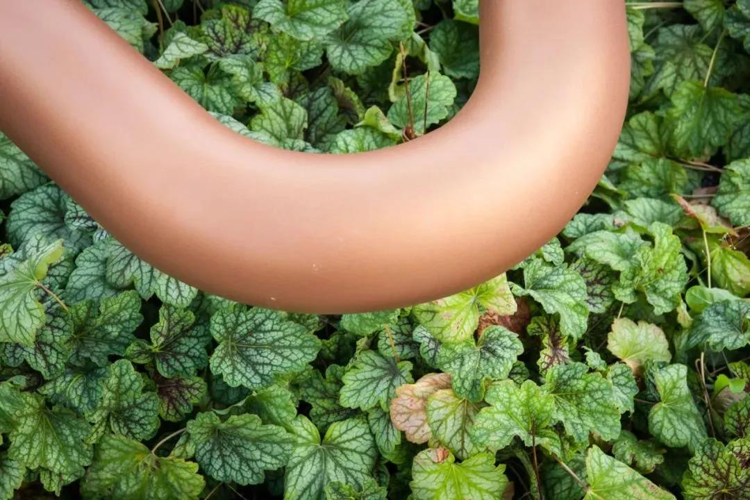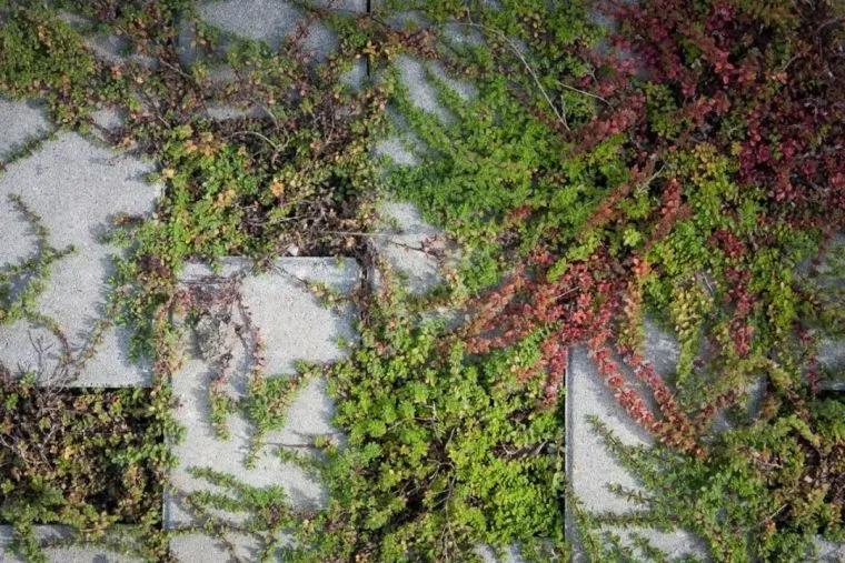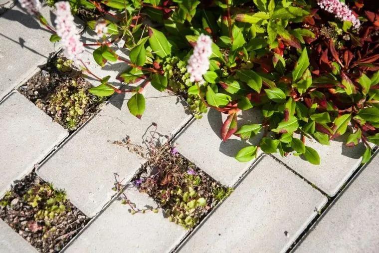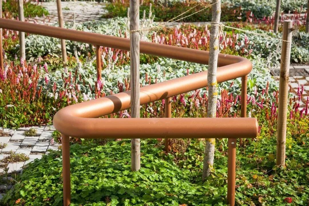 在軟硬鋪裝結合的基礎上,植物區與純鋪裝的阻攔部分采用銅色管狀阻隔物。銅色是溫暖的顏色,有利于