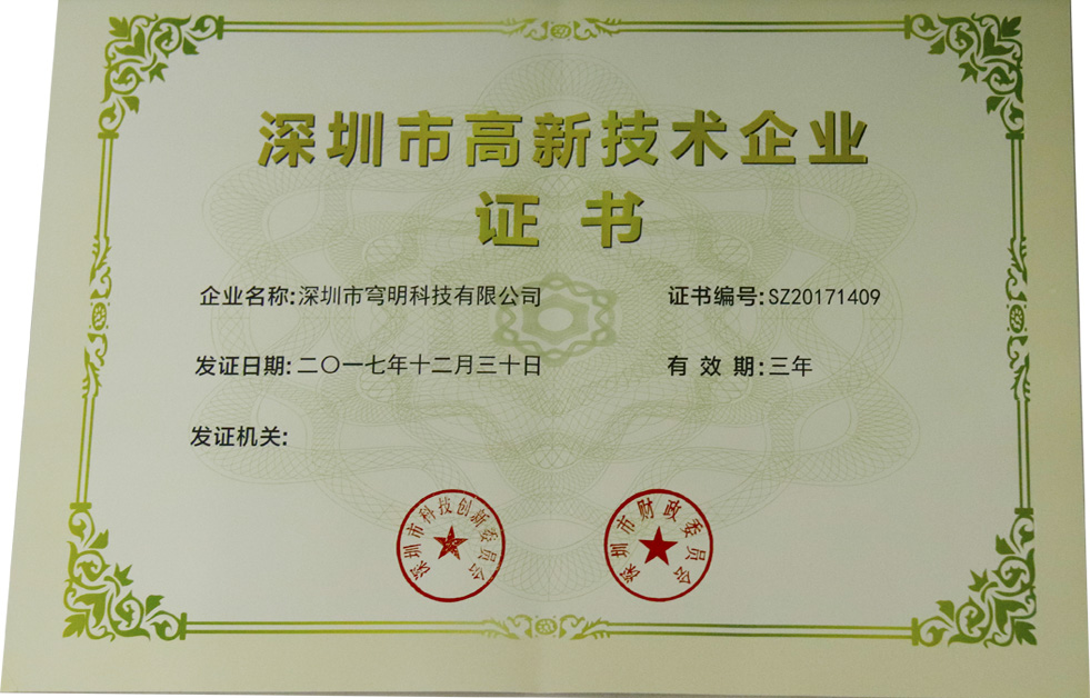 依據《深圳市高新技術企業認定管理辦法的規定,深圳市科工貿信委市財政委組織專家,經過層層嚴格的審查,我司憑借優秀的研發實力和創新能力,通過深圳市高新技術企業認證。