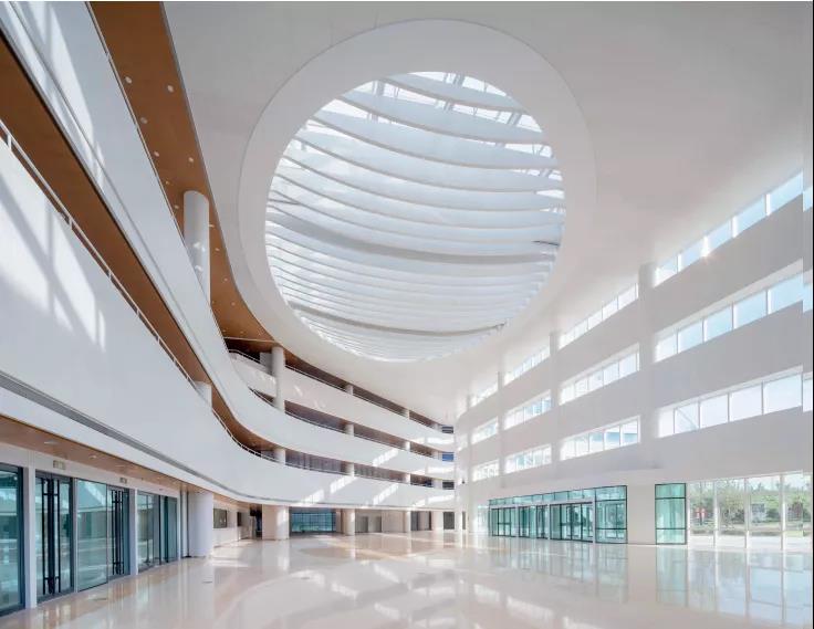 由于院區(qū)用地呈不規(guī)則的梭形,且用地處于西側(cè)城市主要交通與東側(cè)居住區(qū)的過渡區(qū)域,方案創(chuàng)新性地引入“城市客廳”的設(shè)計(jì)理念,用地中心位置的開敞共享公共大廳不僅作為與城市、居住區(qū)進(jìn)行空間對話的形象節(jié)點(diǎn),而且將整個院區(qū)各功能自然地整合在一起。