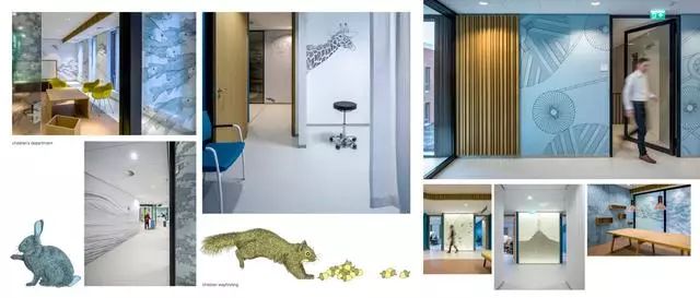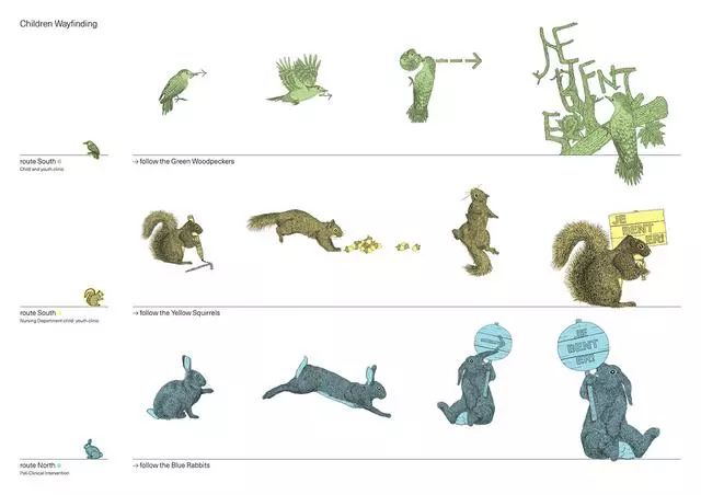 這個醫(yī)院還特別為孩子們設(shè)計了一套圖形導(dǎo)視系統(tǒng)。循著綠色啄木鳥、黃色松鼠和藍(lán)色兔子的腳印,去到一個個不同的醫(yī)療單元時,看病的心情或許會完全不一樣了吧。