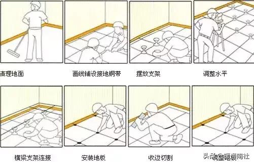 基層處理與清理->定位放線->粘貼導(dǎo)電銅帶->安裝固定可調(diào)支架和橫梁->鋪設(shè)活動地板面層->防靜電接地->竣工清理
